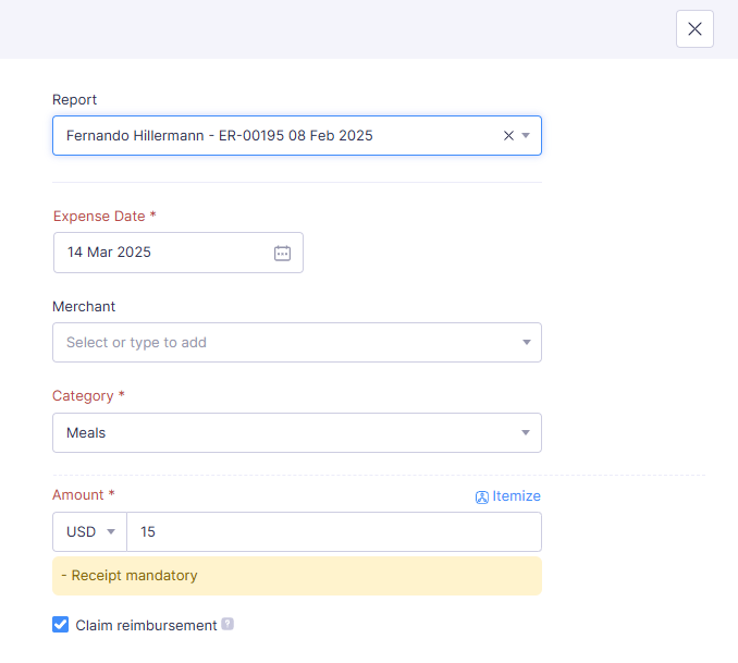 - Claim reimbursement: check this option if you paid this expense from your own money and are expecting the company to reimburse you