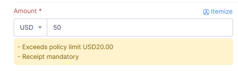 - Category: select the appropriate category for the expense. Remember that the company can set limits per category and, if you exceed an authorized limit, you won't be able to save the expense: