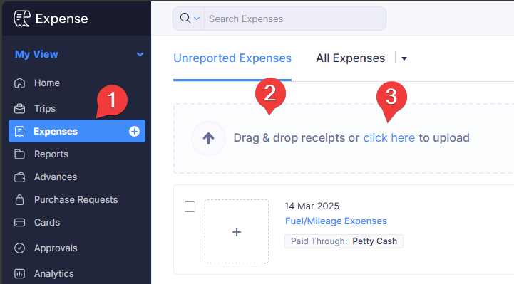 It's easy to record expenses through Zoho Expense. To do this, login and click the "Expenses" menu to the left: