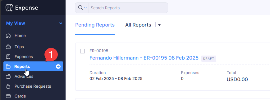 An expense report is a category that groups expenses that share something in common. For example, you could have a weekly expense report that groups all expenses made within that week. To manage reports, click the "Reports" menu to the left: