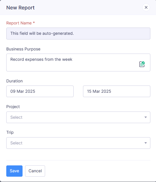 - Report: reports are "categories" under which you can group expenses. This is useful to keep expenses grouped together so that approval process is easier. For example, a report could be generated automatically by the system every week, so that you can add your weekly expenses there
