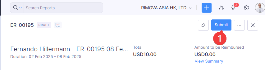 When you click on a report, you can see all the expenses that have been linked to it. If the report is complete, you can click the "Submit" button to send it for approval:
