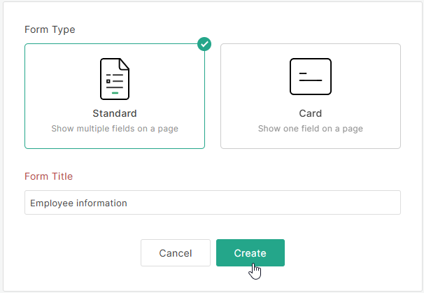 To create a new form, click on the "New form" button to the right. Select the form type (either multiple fields on a page or one field per page) and give the form a name. Once done, click the "Create" button: