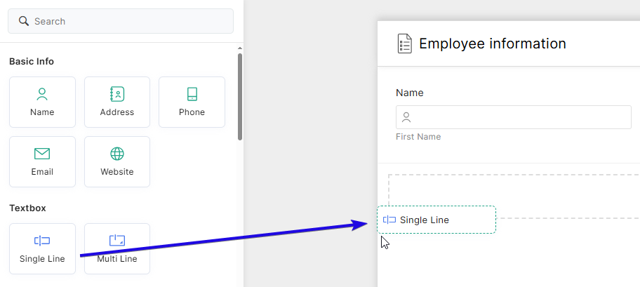 In the builder menu, drag and drop the desired type of field on the left, to the canvas in the center or double click it: