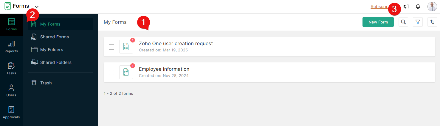 As soon as you access the application, to the center you will see all existent forms [1]. To the left, you have access to the menus [2] and, to the right, you can create a new form or use the search: