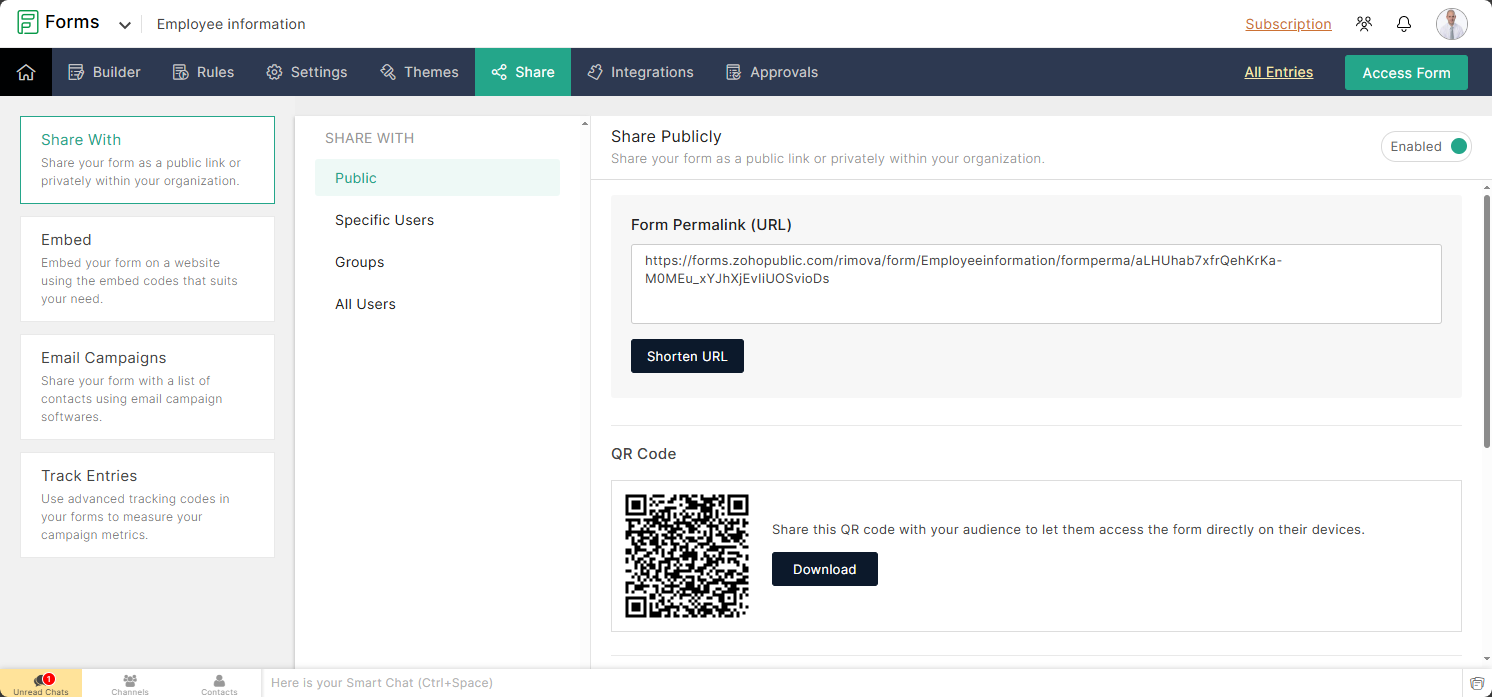 - Integration: from here, you can connect your form to other applications like Microsoft Excel, Google Sheets, Salesforce or Zoho applications like Zoho Desk, Zoho Sheet or Zoho Projects