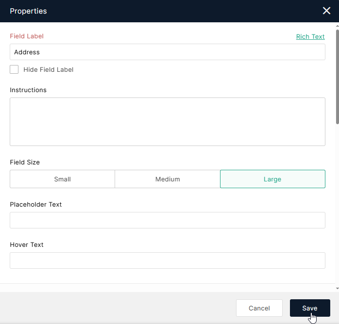 Once the field is added, you can change the properties of the field by clicking the right option: