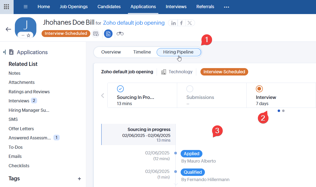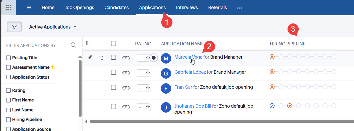 Hiring a candidate is a process that requieres the execution of several steps. To better keep track of these steps, Zoho Recruit has a "hiring pipeline" that shows at any moment, where is the candidate located within the recruitment process. To check this, click on the "Applications" module: