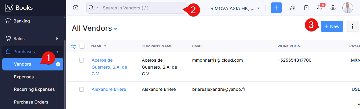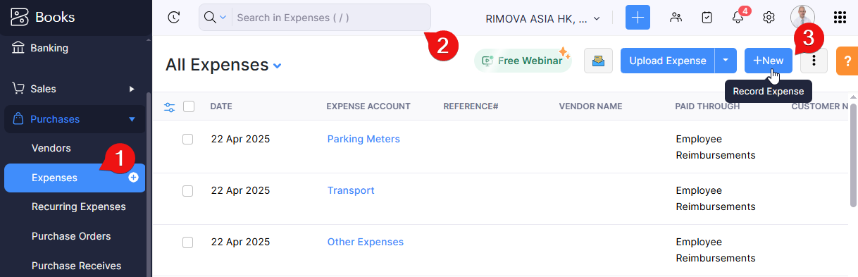 Similarly, you can record expenses, purchase orders, purchase receives, bills, payments made, recurring bills and so on. Just click the appropriate option to the left depending on your needs (for example, "Expenses" [1]) and you will have access to all the documents created. You can use the search bar to look for specific records [2] and click the "New" button [3] to the right to create a new document: