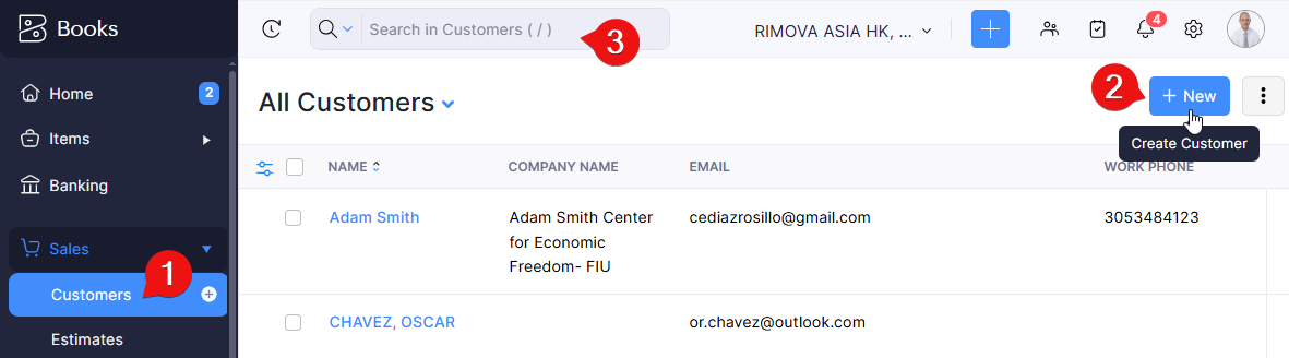 To work with the sales flow, click the "Sales" module to the left. First thing you need to create are customers. To do this, click the "Customers" [1] menu and then "New" [2]. You can also search for any customer by using the search bar [3]: