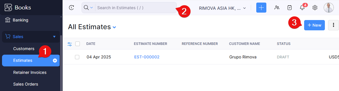 Similarly, you can create estimates, retainer invoices, sales orders, packages, shipments, invoices, sales receipts, payment links, record payments received and so on. Just click the appropriate option to the left depending on your needs (for example, estimates [1]) and you will have access to all the documents created. You can use the search bar to look for specific records [2] and click the "New" button [3] to the right to create a new document: