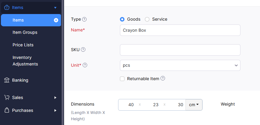 - Items: allows you to work with items, items groups, price lists and inventory adjustments, to better handle the products your company works with