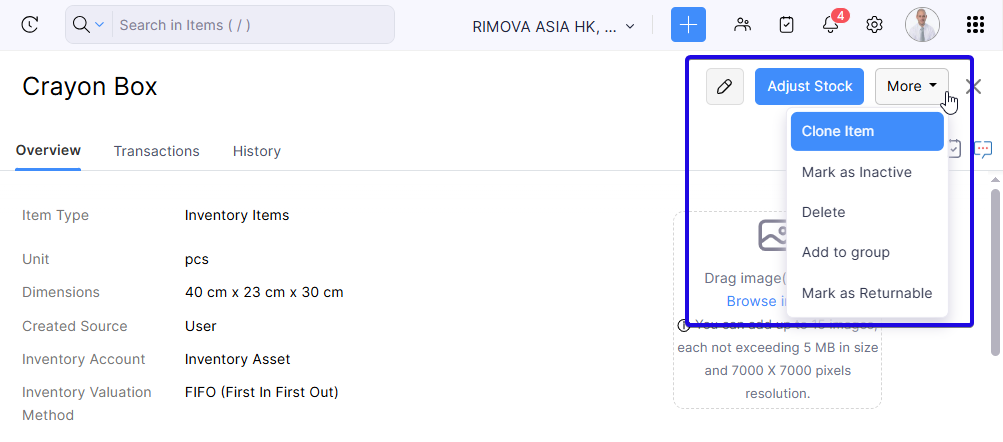 You can edit, adjust stock, mark as inactive, delete, etc. an item by clicking on its name and selecting the appropriate option to the right: