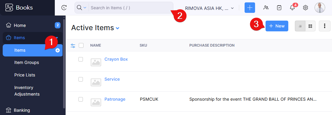 To manage items, clic the "Items" menu to the left, and then click on "Items" [1] again. In the center of this page, you will see the list of existing items. You can search for a specific item using the search bar [2] or create a new element by clicking the right "New" button [3]: