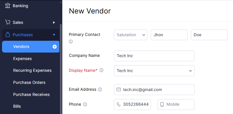 - Purchases: allows you to manage everything related to purchasing items, including vendors information, expenses, purchase orders, bills and payments made