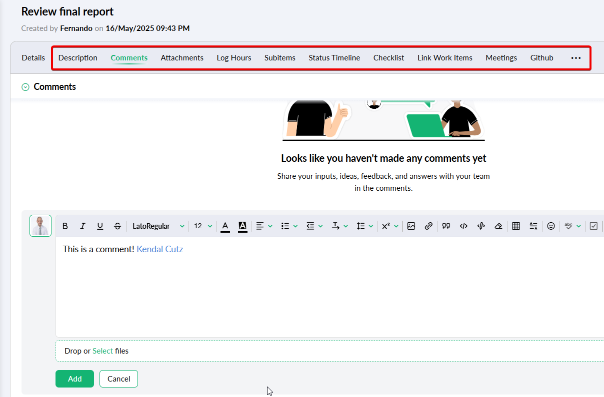 Also, you can use the upper tab to add a description, comments, attachments, log hours, create subitems, checklists and so on: