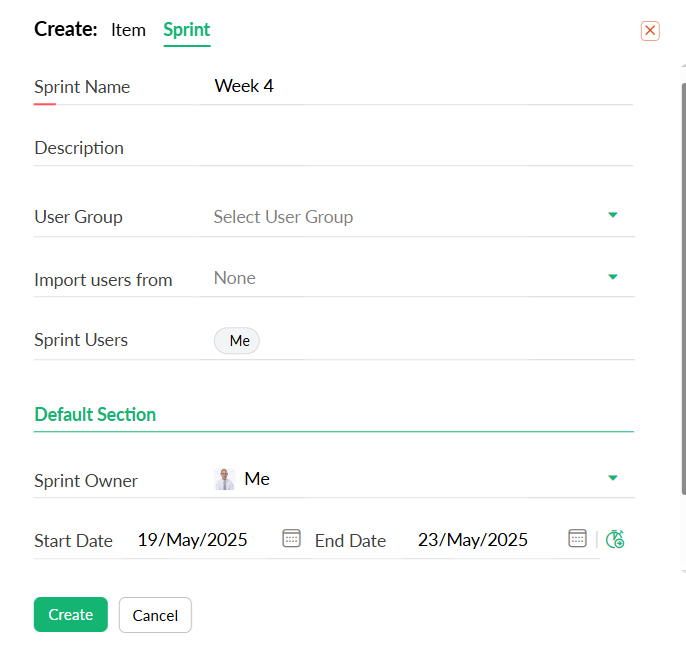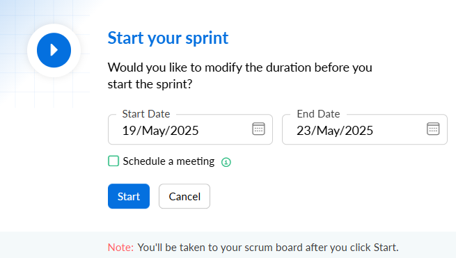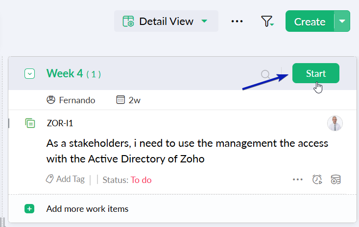 Bear in mind that you can assign a name, a sprint owner (the person that's going to be working on it) and the start date and end date. At any time, you can start a sprint to tell Zoho Sprints that you are going to start working in those week activities:
