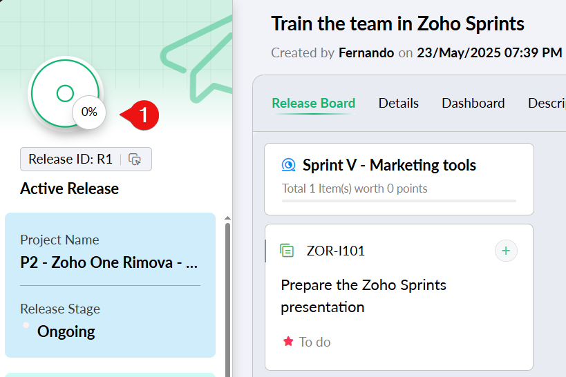 The progress of the release will update automatically It as the status of tasks changes to "Done":