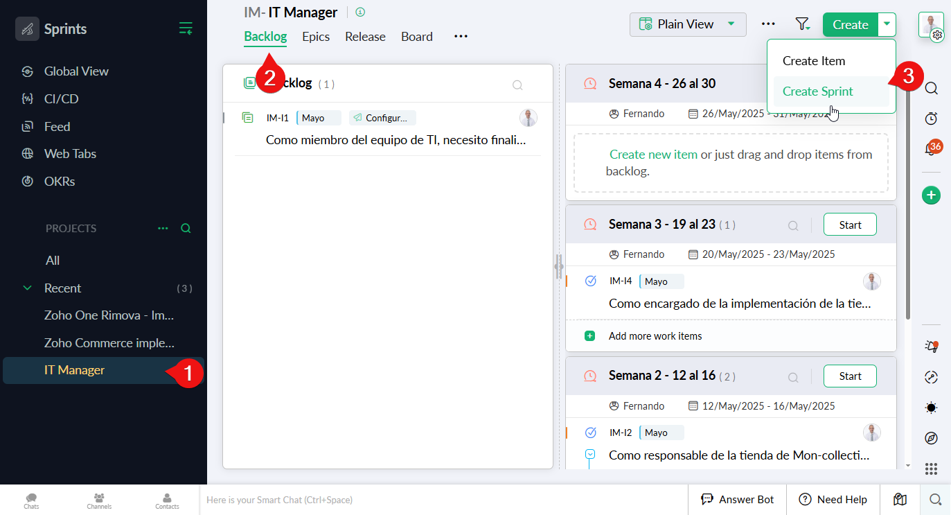 When working with Sprints, you can start by creating your sprints, which are the working weeks. To do this, select the project [1], make sure you are located in the backlog tab [2] and click the arrow next to the "Create" button, to add a new sprint [3]:
