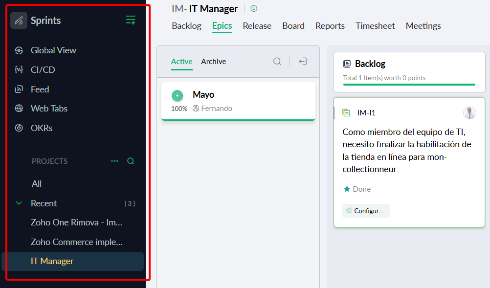 As soon as you access Zoho Sprints, you will see, to the left, a menu that gives you access to all the projects and related sprints options: