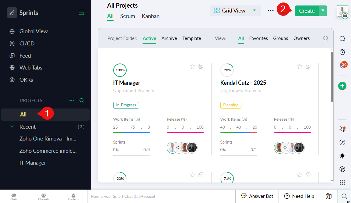 From here, you can select a project or create a new one, by clicking on the "All" section and then on "Create":