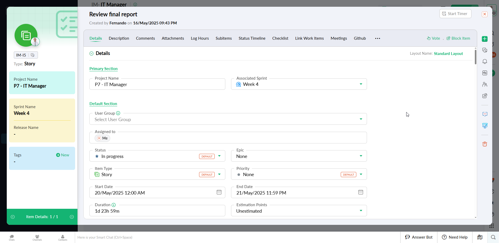 Enter the item name, add it to the appropriate sprint, assign it to your user, change the status, start and finish date and, also, ensure to change the "Item type" to "Task". Once done, press "Create".