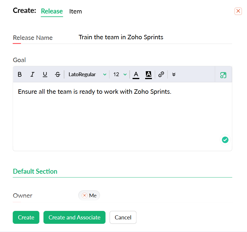 Now, enter all required information, including the name of the release, the goal, the start and release date, and the stage. Press "Create" when ready: