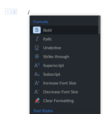 When editing documents, you can use the slash (/) to access Zoho Writer commands: