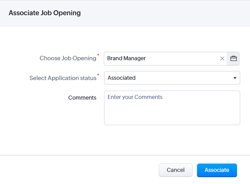 Now, choose the job opening, the application status and write down any comment. Finally, press "Associate":