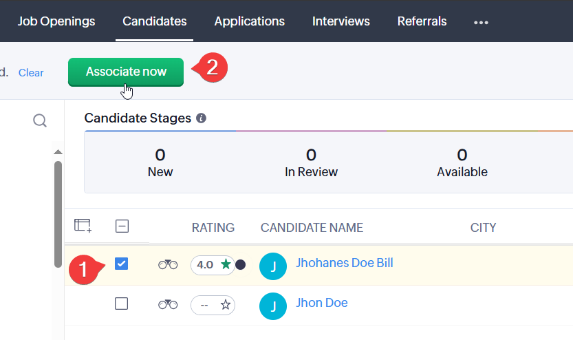 Now, select the candidate you want to link to a job opening and click the "Associate now" button: