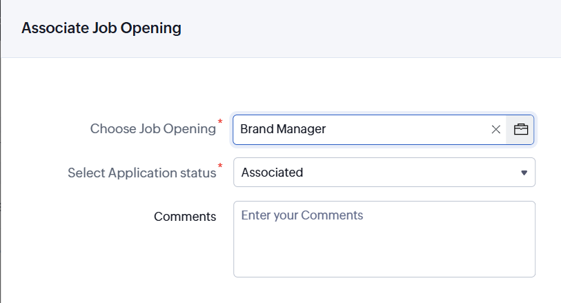 If you decide to associate a candidate to a job opening, a new window is going to be displayed. Select the job opening, the status and type any comment. Then, click "Associate":