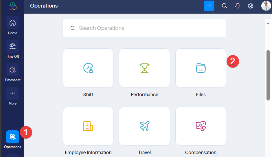 HR managers and HR team members can upload files and make them available for one or several departments, for one or more locations or for the entire organization. To upload a file, click the "Operations" button located at the bottom left side of the page and then select "Files":