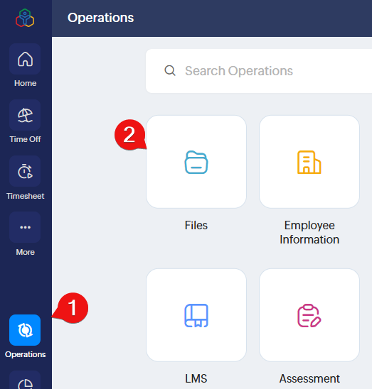 The first step in this process is to upload a file to be signed. To do this, access Zoho People, click "Operations" and then "Files":