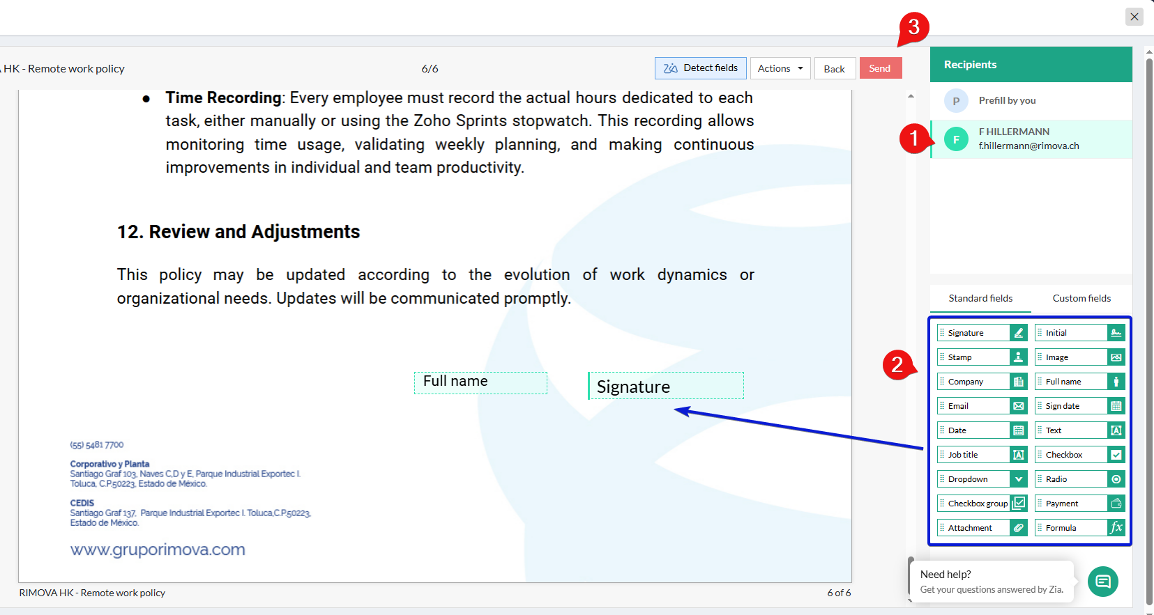 Press "Send" when ready. A new "Zoho Sign" window opens. From here, select the recipient [1] and drag and drop the fields to include in the document [2]. Once ready, press "Send" [3]: