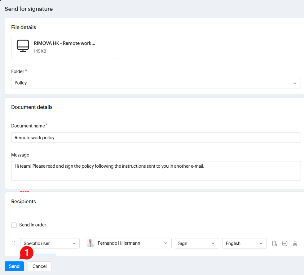 Upload a document and fill all details like folder, document name, message and the recipients: