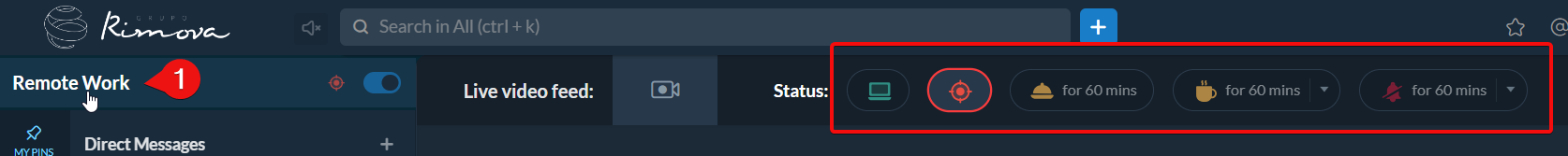 You can use this same switch (turn it off) to check out as well. Also, click on "Remote work" to access other options that will help you define your actual status (available, busy working, etc.) and to specify if you are going to take a break: