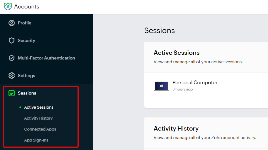 To see the history of your active sessions, as well as your activity history, connected apps and app sign-ins, go to accounts.zoho.com, log in and then click on the "Sessions" menu to the left. Then click on the appropriate menu to see the required information: