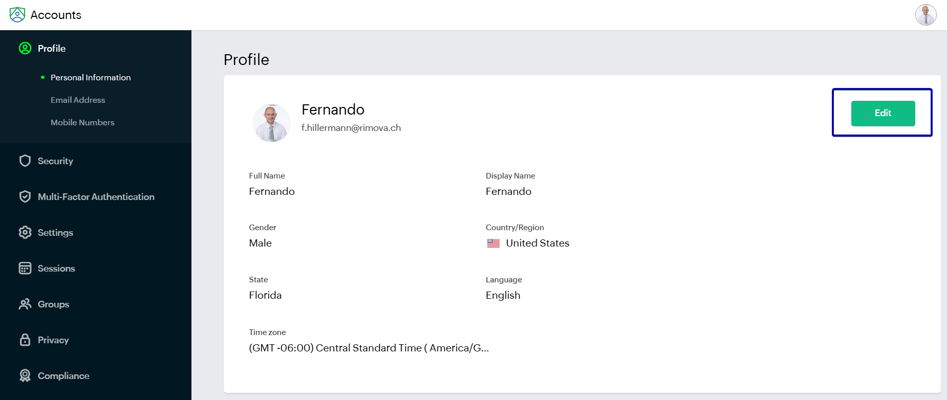 accounts.zoho.com, log in and then click on the "Edit" button to the right: