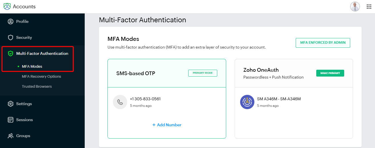 go to accounts.zoho.com, log in and then select the "Multi-factor authentication" menu on the right, and then click on "MFA Modes":