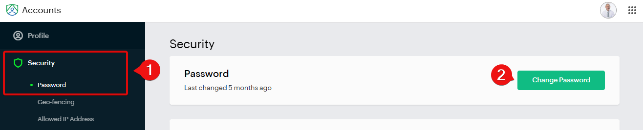 go to accounts.zoho.com, log in and then click on the "Security" menu to the left. Then click on "Password" and finally, click on the "Change password" button: